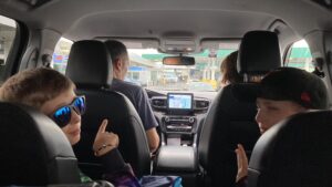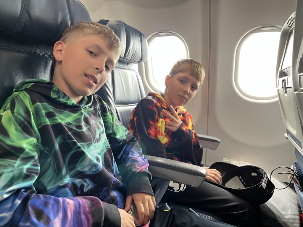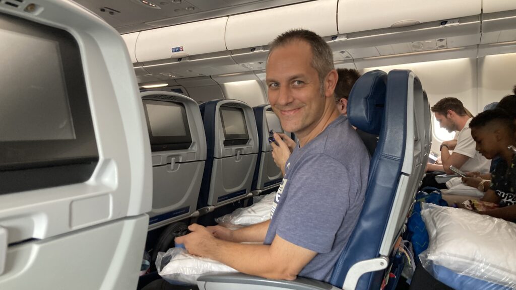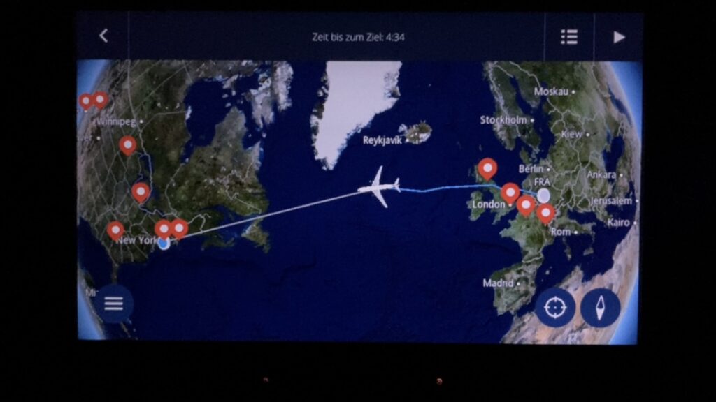 Der Flug ansich ist „smooth“, keine Turbulenzen. Über Amsterdam nach England, über Irland führt die Route auf den amerikanischen Kontinent. Das Flugzeugessen mundet Erik und Hannes nicht so – es schmeckt halt so wie es schmeckt. Nicht sooo lecker. Dafür sind sie begeistert vom Entertainment System, schauen Minions-Filme. Mit Hannes spiele ich sitzübergreifend Tic Tac Toe – jeder an seinem Bildschirm.