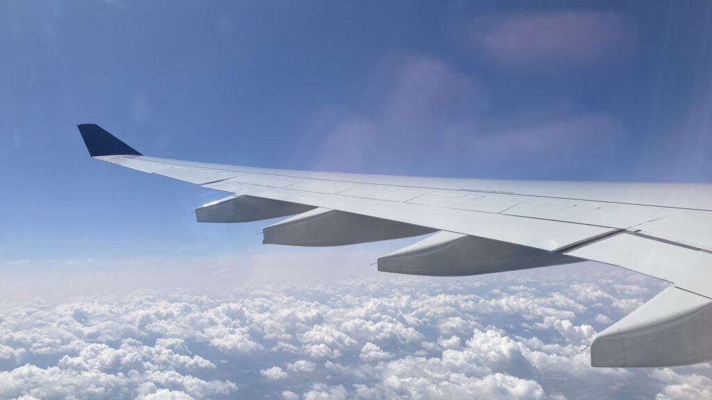 Endlich: Fast vier Stunden später als geplant, um 14:30 Uhr, rollen wir im Airbus 330-200 von Delta Airlines auf die Startbahn des Frankfurter Flughafens. Die Maschine war zuvor aus Detroit verspätet losgeflogen wegen Schlechtwetter. Für Phine, Hannes und Erik ist es der erste Flug – und den meistern sie ganz gut. Josephine sitzt am Fenster, hält alles mit dem Smartphone fest, auch Erik hat eine gute Sicht auf den Flügel. Um zu wenig Fotos oder Videos brauche ich mir keine Gedanken machen 😉