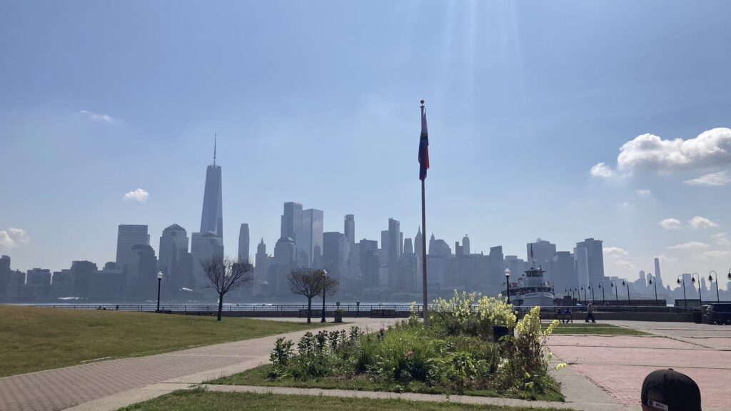 Nachdem es nachts wieder geregnet hat, brennt nun die Sonne vom stahlblauen Himmer runter, als wir auf die Fähre warten. Genauer gegenüber liegt die Skyline von Manhattan, besonders das One World Trade Center ragt in die Höhe. Josephine steht mit offenem Mund da. Nice!