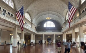 On Ellis Island are the buildings where for decades immigrants from all over the world landed to be registered. We walk through the halls, which today house a museum on the history of immigrants. In the Register Room, all the data of the arrivals was recorded in detail. On the Internet, I had found the form on which Friedlieb Bierwas is listed: from his origin, eye color, possible diseases to how much money he has, everything is listed. The hall with its high vaulted ceiling, the rusty tiles and the two huge US flags are impressive.