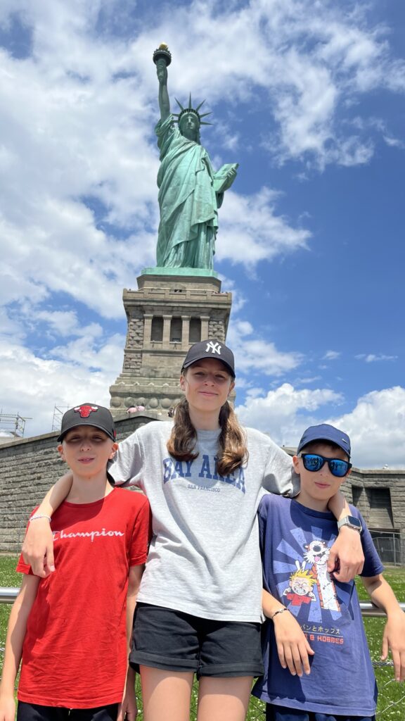 Wir erklimmen noch ein Aussichtsdeck über dem neu geschaffenen Museum. Dort hat man eine tolle Aussicht auf die Skyline – die Freiheitsstaue streckt uns dagegen ihren Hintern entgegen – nein, natürlich ihren entzückenden Rücken! Die Kinder treffen Tim, den Marienkäfer, der mal auf jedem Arm und jeder Hand rumkrabbeln darf. Danach stellen wir uns wieder in Schlange vor der Fähre, um nach Ellis Island zu gelangen. Erik und Hannes sind inzwischen dicke mit Joel und Skyler. Sie führen sich gegenseitig einige dance moves vor, während wir warten – zu unser allem Spaß.