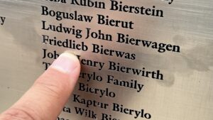Zusammen laufen wir draußen an der American Immigrants Wall of Honor entlang. Abertausende Namen von Einwanderern sind hier in die Metalltafeln eingraviert, zumeist haben die Nachfahren dafür gesorgt und bezahlt. Nach etwas Suche finden wir ihn – Friedlieb Bierwas, Panel 41. Die Verbindung zwischen uns Siegerländern und den Familien Bierwas und Hanisch aus New Jersey. Die Kinder finden auch meinen Namen: Christian Albrecht! Wusste och, dass der Name weltbekannt ist 😉
