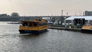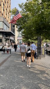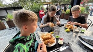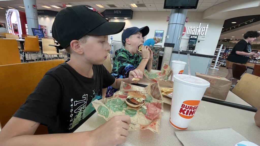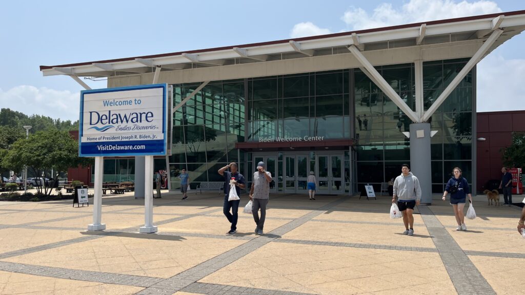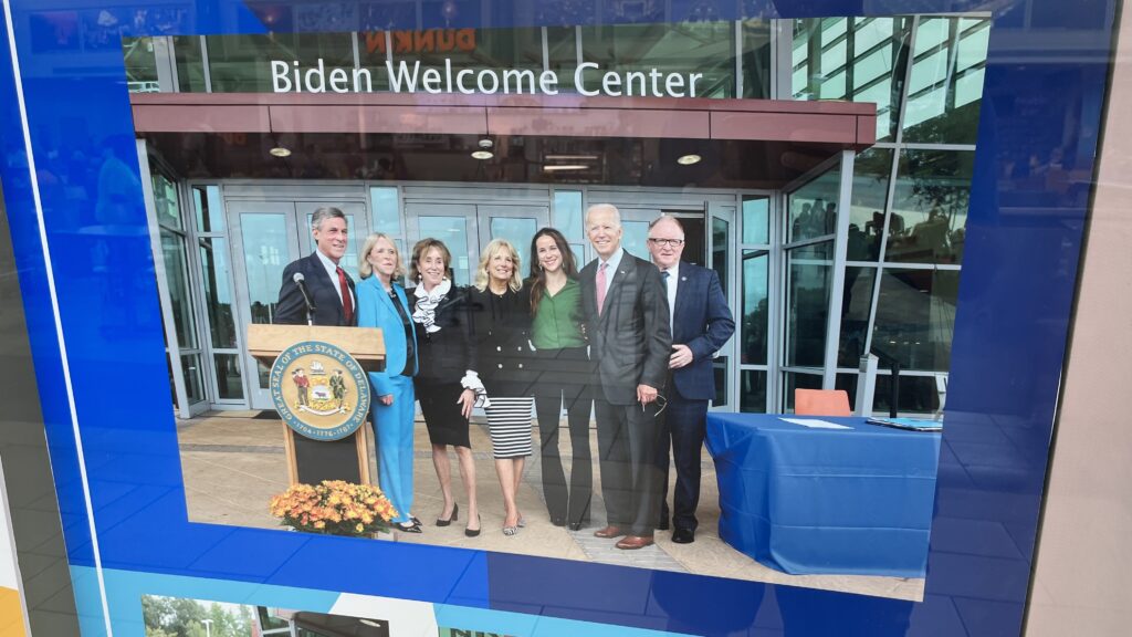 Eine etwas längere Pause legen wir in Delaware ein, Home of Joe Biden, und so heißt die Raststätte „Biden Welcome Center“ und dort hängen Fotos von ihm bei der Eröffnung. Das Ganze ist ein Food Court mit mehreren Ständen von Fastfood-Restaurants außen und Tischen in der Mitte. Josephine und ich teilen uns ein belegtes Bio-Sandwich mit Mozzarella, Christian isst Hühnchen von Popeye und Erik und Hannes einen Whopper Jr. Das ist das Gute an Food Courts: Jeder findet etwas, das ihm schmeckt, und man trifft sich zum Essen in der Mitte.
