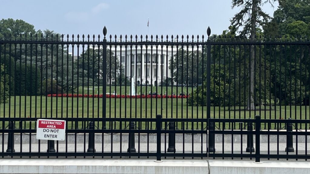 Nach dem obligatorischen Stau parken wir in demselben Parkhaus wie gestern, fahren dann aber zwei Stationen mit der Metro. Nach einem kurzen Fußweg stehen wir an der Rotunda. Carol hatte beim Frühstück erzählt, dass sich vor einiger Zeit ein kleines Kind durch den Zaun zum Weißen Haus gequetscht hatte und von der Security zurückgebracht werden musste. Das wäre jetzt gar nicht mehr möglich, denn man kann nicht mehr bis an den Zaun gehen, sondern nur von der anderen Straßenseite auf den Zaun gucken, hinter dem sich ein großes Grundstück befindet, auf dem in einiger Entfernung das Weiße Haus steht. Hannes und Erik machen Fotos von den Schultern von Skyler und Joel aus. Ein unheimlicher Mann packt einen Gebetsteppich aus und ruft mehrfach laut „Allahu akbar“. Ein unsympathischer Deutscher fotografiert ihn.