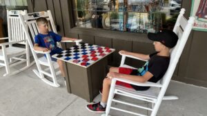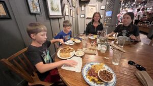 Am Nachmittag machen wir uns auf den Rückweg und stehen bis Baltimore überwiegend im Stau. Bei Philadelphia legen wir einen Essen-Stopp bei „Cracker Barrel“ ein. Dabei handelt es sich um eine Kette, die im Südstaaten-Stil eingerichtet ist und auch entsprechendes Essen anbietet. Gestern im Diner habe ich den Tipp bekommen, dass man oft den ganzen Tag Frühstück bestellen kann, und dabei findet man dann meist etwas Vegetarisches. Daher esse ich heute Eier, Biscuits (Buttermilchbrötchen) und Hashbrowns (ähnlich wie Rösti).