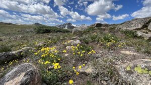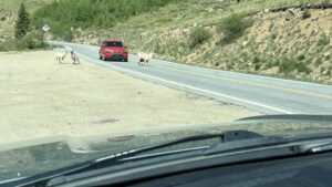 After breakfast, we take down the tents, pack up the camping gear. We won’t need them again until we reach Capitol Reef National Park. Highway 82 winds in curves up the mountain – we drive over Independence Pass. To the left or right of the road the mountain drops steeply. We drive higher and higher, some snow and ice fields are still there, although it is July. The view from the top is breathtaking. The pass is 3686 meters / 12,095 feet high – it is for us the highest point on earth we have ever been. Up here is the Continental Divide, that means on the eastern side the water flows into the Atlantic Ocean, on the western side into the Pacific Ocean.