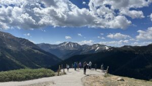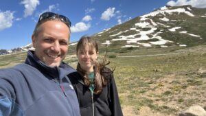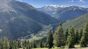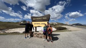 Nach dem Frühstück bauen wir die Zelte ab, packen die Campingsachen zusammen. Die brauchen wir erst wieder im Capitol Reef Nationalpark. Der Highway 82 windet sich in Kurven den Berg hoch – wir fahren über den Independence Pass. Links oder rechts neben der Straße fällt der Berg steil ab. Wir fahren höher und höher, einige Schnee- und Eisfelder sind immer noch da, obwohl es Juli ist. Der Ausblick von oben ist atemberaubend. Der Pass ist 3686 Meter / 12,095 feet hoch – es ist für uns der höchste Punkt der Erde, auf dem wir jemals waren. Hier oben ist der Continental Divide, dass heißt auf der östlichen Seite fließt das Gewässer in den Atlantik, auf der westlichen Seite in den Pazifik.