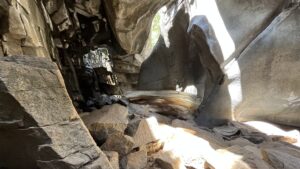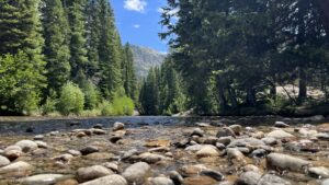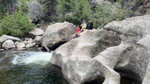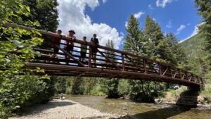 Kurz vor Aspen halten wir bei The Grottos. Ein kurzer Rundweg führt uns erst über eine Brücke über den Roaring Fork River. Das Wasser ist glasklar, man kann die runden Steine im Flussbett erkennen. An einer Felspalte klettern Leute runter – hier ist die Ice Cave. In der schmalen, schattigen Spalte befindet sich ein Hohlraum, in dem das Eis langsamer schmilzt. Man muss bei jedem Schritt aufpassen. Ein Mann läuft übers Eis und fällt, zum Glück ist nichts passiert. Weiter oben stürzt der Bergfluss tosend über mächtige Felsbrocken – Cascades. Wir klettern etwas höher und machen eine Snackpause. Der Anblick ist sensationell, so stellt man sich die Rocky Mountains vor.