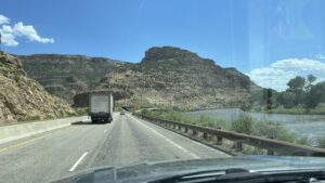 Weiter geht die Fahrt durch Aspen, den berühmten High Society Skiort. Eigentlich wollen wir anhalten, um etwas zu essen, aber es gibt nur fancy Restaurants, keine einzige Fast Food Kette. Die ersten roten Felsen, mit Büschen bewachsen, tauchen auf, es beginnt zu regnen. Am Stadtrand liegt der Flughafen. Dort stehen unzählige Privat-Jets nebeneinander – Wahnsinn. Wir halten etwas später an, um aus der Kühlbox alle Zutaten für Sandwiches zu holen, die wir dann im Auto während der Fahrt essen. Das satte Grün der Berge hat sich inzwischen in braun, ocker und rotgefärbte Felsen verwandelt, die Straße windet sich mit dem Colorado River.