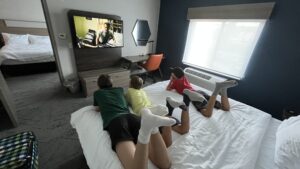 Als wir in Grand Junction am Hotel aussteigen, schlägt uns die Hitze ins Gesicht. Die Anzeige im Auto zeigt 35 Grad Celsius / 98 Grad Fahrenheit an! Auf dem Independence Pass ein paar Stunden zuvor waren es 13 Grad Celsius / 56 Grad Fahrenheit. Es ist ein Tag der Extreme, von ganz oben 3686 m / 12,095 feet auf 1396 m / 4583 feet. Wir freuen uns alle total aufs Hotel und die Dusche. Einer nach dem anderen springt unter die Brause – nach zwei Tagen einfachem Zeltleben lernen wir die Errungenschaften der Zivilisation schätzen 😉 Alle Powerbanks, der Laptop, Akkus werden aufgeladen.
