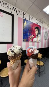 Erfrischt fahren wir zu Denny’s und essen dort Burger, Veggieburger und ich ein paniertes Country-Steak. Danach gönnen wir uns Downtown noch ein Eis bei „Gelato Junction“. Die riesigen Kugeln Schokolade, Cookies n‘ Cream oder Captain America stellen uns echt vor Herausforderungen! Es ist viel, es schmilzt und wir schaffen nicht alles. Wir haben das Eis nicht zu Ende gegessen – das ist uns auch noch nicht passiert! 😊 Downtown Grand Junction ist total unamerikanisch – eine kleine, verkehrsberuhigte Straße, mit Cafes und Einzelhändlern, und Skulpturen alle paar Meter, sehr europäisch. Auf dem Weg zurück zum Hotel wird es wieder amerikanischer – eie breite Straße und Gewerbegebiete mit Autohändlern und Fast Food Ketten.
