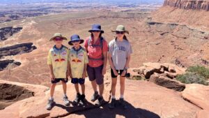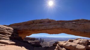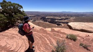 Diesen Morgen lassen wir uns Zeit, frühstücken Rührei und trinken leckeren Orangensaft aus Florida. Wir tragen Sonnenmilch auf, denn auch heute soll es wieder bis zu 38 Grad Celsius / 102 Grad Fahrenheit heiß werden. Dann brechen wir auf in den Canyonlands National Park, dem zweiten Nationalpark in der Nähe von Moab, auf der westlichen Seite gelegen. Zunächst geht es in einigen Kurven wieder bergauf, hoch auf die Hochebene/Mesa und dann oben auf dem Plateau kilometerlang geradeaus durch eine Graslandschaft.