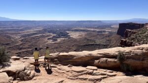 Dann fahren wir noch 10 Kilometer weiter bis zum Grand View Point Overlook. Dort laufen wir entlang der Sandstein-Abbruchkante, an der bis zu 360 Meter tief abfällt. Wie ein riesiger T-Rex Abdruck in der Landschaft schauen wir auf das White Rim auf die Ebene unter uns. Der Blick in die Ferne geht scheinbar ins Unendliche.