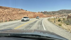 This morning we take our time, have breakfast scrambled eggs and drink delicious orange juice from Florida. We apply suntan lotion, because it’s supposed to get up to 38 degrees Celsius / 102 degrees Fahrenheit again today. Then we leave for Canyonlands National Park, the second national park near Moab, located on the western side. First we go uphill again in some curves, high on the plateau/Mesa and then on top of the plateau for miles straight through a grassy landscape.