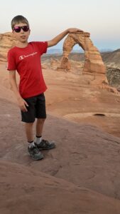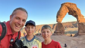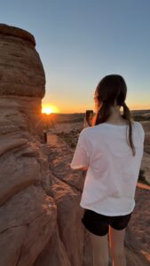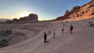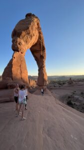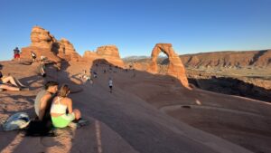 Nach dem frühen Abendessen brechen wir nochmal in die Arches Nationalpark auf, denn wir möchten den Delicate Arch, das Wahrzeichen Utahs, in der Abendsonne bewundern. Der 2,5 Kilometer lange Hinweg bergauf, über Slick Rock ist allerdings echt schweißtreibend in der Abendsonne, die noch nicht sehr nachgelassen hat. Endlich oben angekommen steht er das der komplett freistehende Felsbogen, angestrahlt vom Abendlicht. Ein toller Anblick, besonders mit den entfernten La Sal Mountains im Hintergrund. Einige Menschen sitzen in dem weiten Rund, um das Lichtspiel des Sonnenuntergang zu bewundern. Hannes, Erik und ich laufen rüber bis zum Arch und lassen uns unter ihm fotografieren. Dann packen wir unsere Chips und Gummibärchen aus und genießen die Atmosphäre des Sonnenuntergangs.
