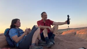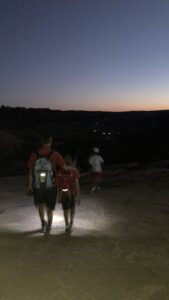Als die Sonne verschwindet am Horizont wird es es angenehmer. Bei anbrechender Dämmerung machen wir uns auf den Rückweg, Hannes und Erik leuchten uns den Weg mit den Kopflampen. Erik wirft verschieden Schatten mit seinen Händen auf den Felsboden, einen Vogel, Hasen und ein Herz. Als wir am Parkplatz ankommen, ist es schon sehr dunkel. Fledermäuse schwirren um unsere Köpfe uns die Sterne werden sichtbar. Nach einer Viertelstunde Autofahrt innerhalb des Parkes halten wir noch mal an, denn jetzt ist es richtig dunkel um 22:30 Uhr. So viele Sterne, man kann sogar das Band der Milchstraße erkennen. Vor allem Josephine bleibt die Spucke weg. Minutenlang starren wir in den Sternenhimmel.