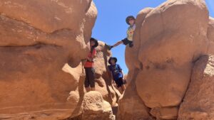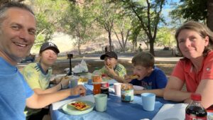 Then we wade through the Fremont River, which flows right past the campground. A few thick fair weather clouds make it a little more pleasant. For dinner we cook Mexican on the camp stove, wraps and tortillamais boats. We play Bohnanza and Erik and Hannes light the campfire. It’s still warm after the sun has disappeared. But that makes camping much more pleasant: there is running water and it is warm. The sleeping bags are just blankets tonight.