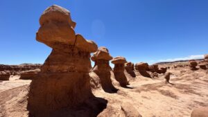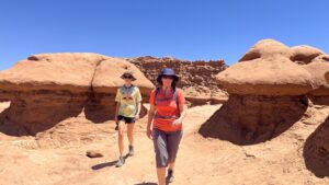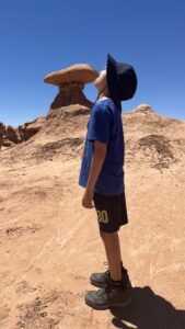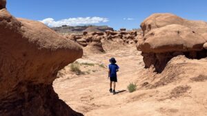 On the drive over the Interstate 70 to the west the roads are drawn out to the distance. Very monotonous to drive. The landscape is vast, with plateaus or mountains in the distance, and lots of low bushes. The UT-24 road to Hanksville is not much different. At some point, we come to the turnoff for Goblin Valley State Park. In the shade of a covered picnic area we eat our sandwiches first.
