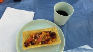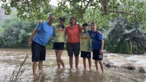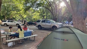 Danach waten wir durch den Fremont River, der direkt am Campingplatz vorbeifließt. Ein paar dicke Schönwetterwolken machen es etwas angenehmer. Zum Abendessen kochen wir mexikanisch auf dem Campingkocher, Wraps und Tortillamais-Schiffchen. Wir spielen Bohnanza und Erik und Hannes zünden das Lagerfeuer an. Es ist immer noch warm, nachdem die Sonne verschwunden ist. Aber das macht das Campen doch viel angenehmer: Es gibt fließend Wasser und es ist warm. Die Schlafsäcke sind heute Nacht nur Decke.