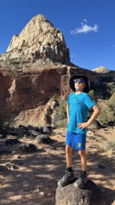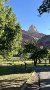 When it’s warm and there’s running water, camping is so much more enjoyable! Just like at Fruita Campground in Capitol Reef National Park. The kids tent is awake first and discovers six deer attracted by the fresh grass of the campground. We have a leisurely breakfast among the trees while the sun begins to shine on the red-brown-ochre rock walls all around. This campground is simply uniquely situated.