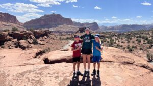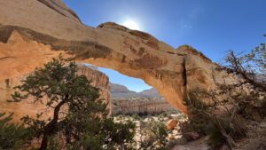We take down the tents and start the hike to Hickman Bridge. It’s only 2.5 kilometers long, but it’s steeply uphill, first directly on the rock wall and then in serpentines higher and higher. From here we catch a glimpse of Capitol Dome, the park’s namesake, because its whitish, round shape is reminiscent of the Capitol in Washington, D.C. And reef, because this “wrinkle” in the landscape formed millions of years ago and caused the rocky landscape that inspired the “reef” part of the park’s name.
