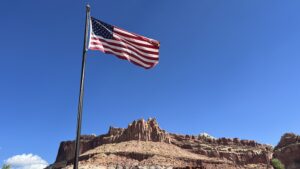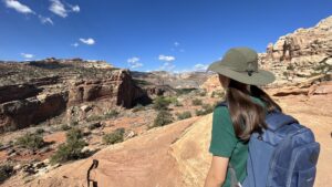 Wir bauen die Zelte ab und machen uns auf die Wanderung zu Hickman Bridge. Die ist zwar nur 2,5 Kilometer lang, geht dafür aber steil bergauf, zunächst direkt an der Felswand und dann in Serpentinen immer höher. Von hier erblicken wir im Gegenlicht den Capitol Dome, den einen Namensgeber für den Park, weil seine weißliche, runde Form an das Capitol in Washington D.C. erinnert. Reef, der zweite Teil des Names, erinnert an die korallenartige Landschaft der Waterpocket Fold.
