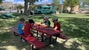 Nach der Talfahrt halten wir in Boulder bei einem mexikanischen Foodtruck. Ein türkiser, ehemaliger Schulbus mit Namen Magnolias. Im schattender Bäume, mit einer frischen Brise essen wir leckere Pommes, Quesadillas und Tacos. Weil es so schön „kühl“ ist, bleiben wir noch länger – und weil ich fünf volle Balken bei der Netzabdeckung habe, und so die Fotos von gestern zum Blogeintrag ergänzen kann, und bei Facebook und Instagram poste.