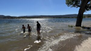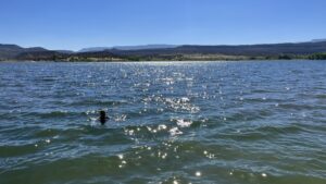In Escalante, our destination, we buy something to grill. The campground in the Escalante Petrified Forest State Park. After we have set up our tents – this is already relatively fast, we jump into the refreshing water of a reservoir, which is located directly at the campground. and after the barbecue, we get back into the car and crash 25 minutes over a dusty gravel road, which shakes us quite a bit. Julia has the feeling that the car door is about to fall off, because the Hole-in-the-Rock Road has very bad grooves, washbeds, washboard.