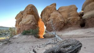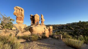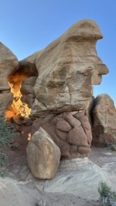 Belohnt werden wir mit Felstürmchen, die aus der Steppe herausragen, und zur Goldenen Stunde von der Sonne angestrahlt werden. Diese Formation heißt ebenfalls „Devil‘s Garden“, genau wie Arches NP. Hier sagen die Fotos mehr als tausend Worte.