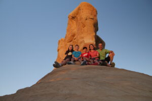 Rock drawings, so-called petroglyphs, we can discover at the next stop on the red walls, drawn by Native Americans. At the Visitor Center I upload the text for the blog, because there is free WiFi here. Otherwise there is no internet or mobile coverage. At Panorama Point we have a great view of the mighty surrounding rock formations, but the wind whistles strongly around our ears. So strong that we have to hold on to our hats and caps. One boy’s hat and sunglasses fly off his head and fall down. Luckily we can drive around the ledge and he can pick up his things in 20 meters depth.